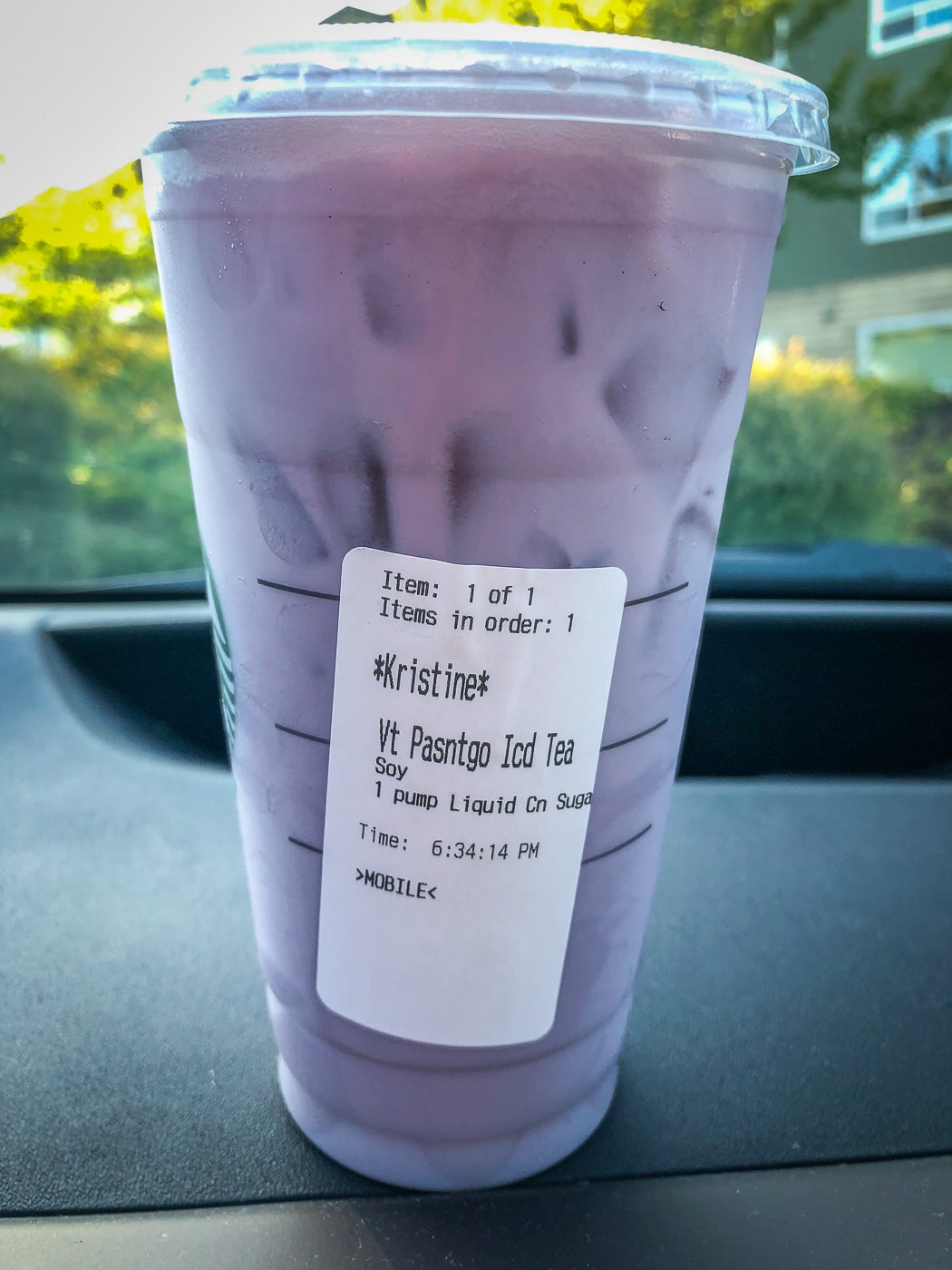 One quick note on variability. I’ve ordered this several times recently and the amount of soymilk the barista has added has varied widely; so much so that sometimes the exact same drink ends up looking pink instead of purple!