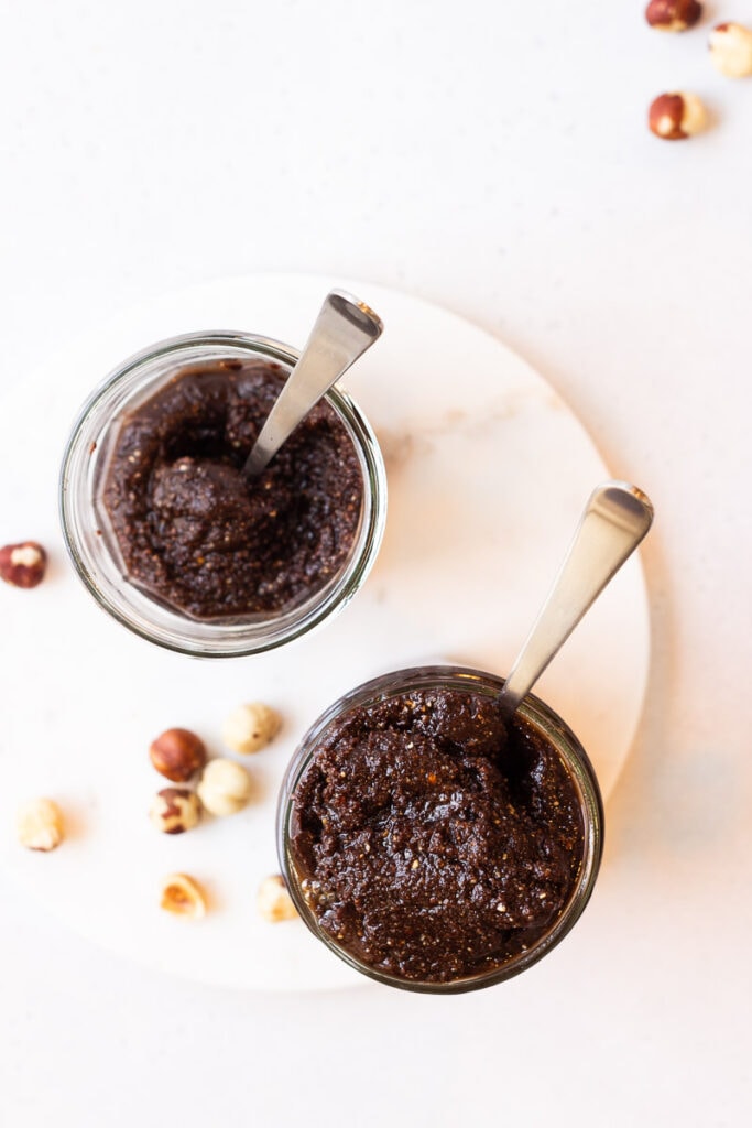 As you can tell from the photos, my chocolate-hazelnut spread is thicker and more rough around the edges than the original, but I like knowing exactly what went into it and where it came from. And I know for sure that it’s a few steps in the right direction from a nutrition label perspective (since palm oil and sugar aren’t the predominant ingredients).
